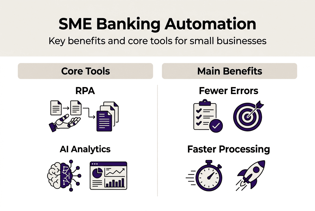 Business banking automation uses technologies like RPA, AI, and BPM to handle repetitive banking tasks without manual intervention. It automates processes including payments, reconciliation, account opening, and compliance checks, reducing errors and processing time for SMEs.
