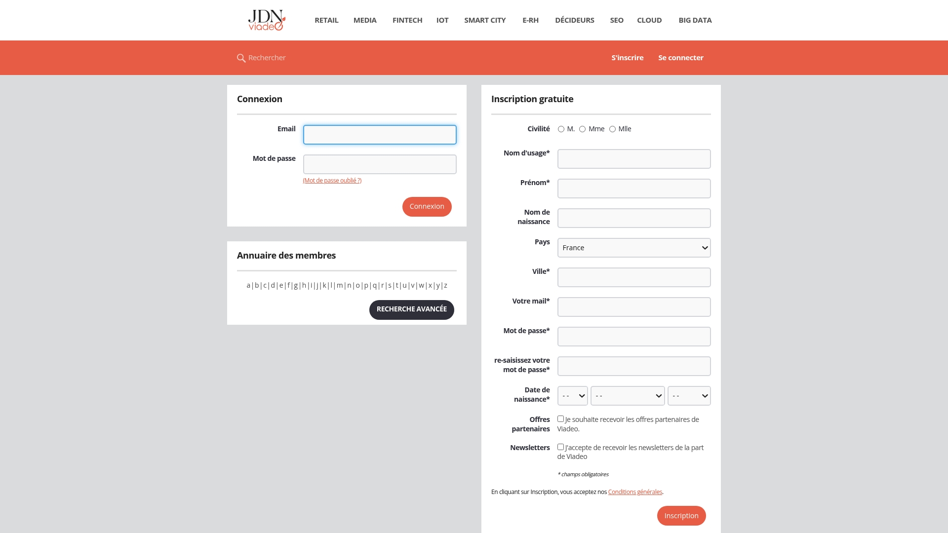 Viadeo Journaldunet offers sector coverage for retail, media, fintech, IoT, and smart city topics along with a searchable member directory and basic registration and login functionality. The site also distributes partner offers and newsletters that surface market intelligence and event updates.
